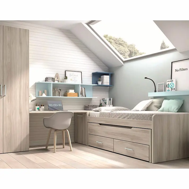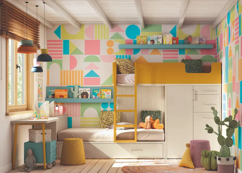 Camas con almacenaje, escritorios ergonómicos y colores vibrantes se combinan en composiciones adaptadas a los espacios reales de las viviendas de la zona.